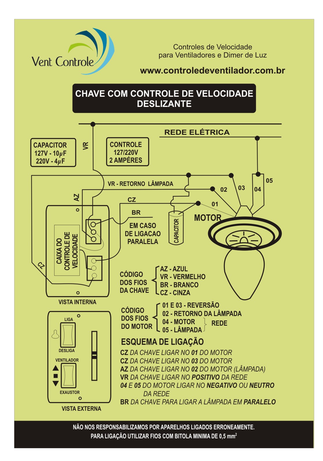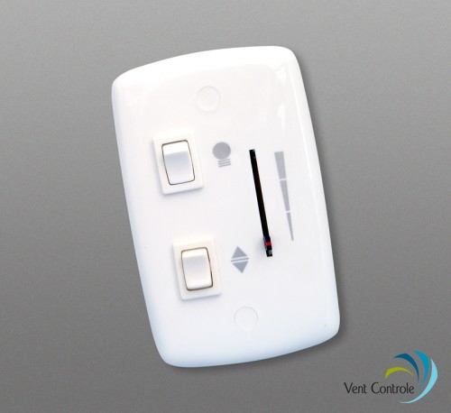 Comando de (02) duas teclas sendo: liga\desliga 01 ponto de luz (incândescente ou flourecente) com ligação paralelo, e 01 tecla de três posições p/ ventilar\desligar\reverter o ventilador.