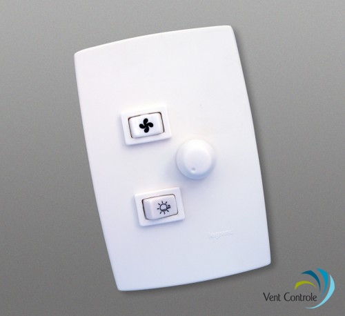 Comando de (02) duas teclas sendo: liga\desliga 01 ponto de luz (incândescente ou flourecente) com ligação paralelo, e 01 tecla de três posições p/ ventilar\desligar\reverter o ventilador.