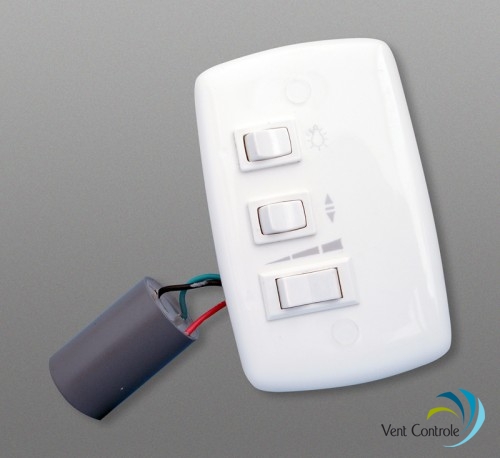 Comando de (03) três teclas sendo: liga\desliga 01 ponto de luz (incândescente ou flourecente) com ligação paralelo, 01 tecla de três posições p/ ventilar\desligar\reverter o ventilador, e 01 tecla de três posições p/ comandar a velocidade ( mínimo\médio\máximo ).