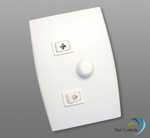Comando de (02) duas teclas sendo: liga\desliga 01 ponto de luz (incândescente ou flourecente) com ligação paralelo, e 01 tecla de três posições p/ ventilar\desligar\reverter o ventilador.