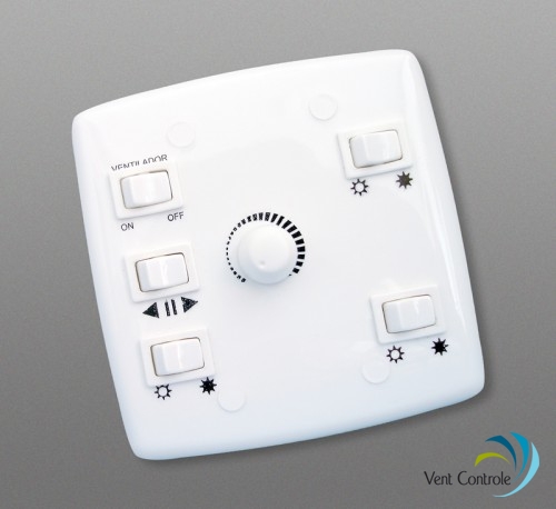 Comando de (05) cinco teclas sendo: liga\desliga o ventilador, ventilação e reversão, liga\desliga 03 pontos de luzes (incândescente ou flourecente) com ligação paralelo.